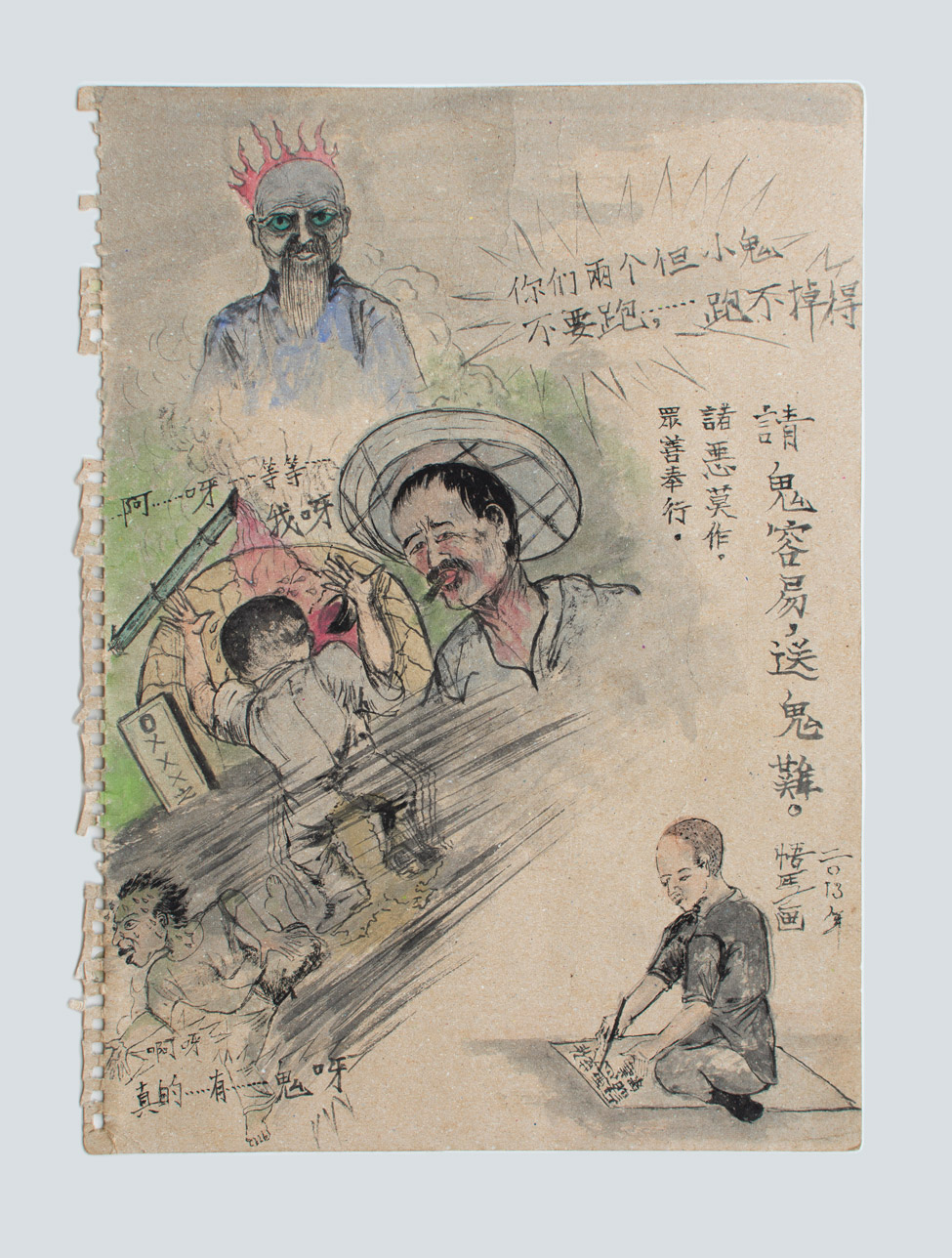 Wu Ma’s body of work, in general, contains elements that are both lofty and whimsical. On the one hand they resemble illustrations found in the book of virtues or mural painting seen in Buddhist temples. On the other hand, they also remind us of the Old Master Q comic. His grassroots sensibility conveys a spontaneous naivety with the urgency of a courtroom sketcher that reflects on his state of mind, socio-political insights of his daily milieu, spiritual inspirations and cultural upbringing. Painting for Wu Ma is perhaps a means to make ends meet. It is also on some level, a meditative and reflective process. Finally, it is his search for a path towards self-redemption.